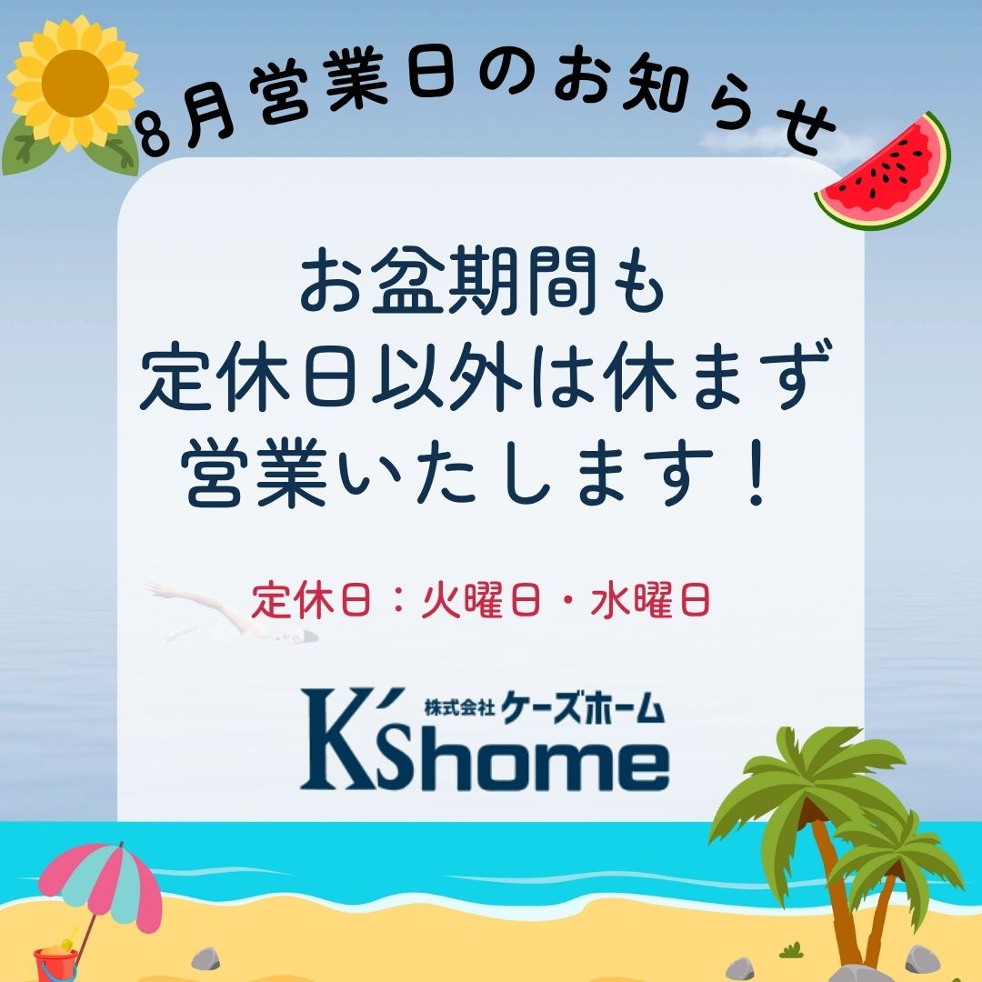 鶴見区・城東区・旭区の不動産は株式会社ケーズホーム > 株式会社ケーズホームのスタッフブログ記事一覧 > 8月営業日のお知らせ